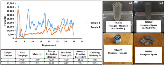 - The materials belonging to Ti6Al4V powder generally absorbed more energy than the other samples in terms of energy absorption efficiency due to their low specific gravity. The normalized hexagonal–hexagonal structure No. 1 showed 4.3 times higher energy absorption efficiency.