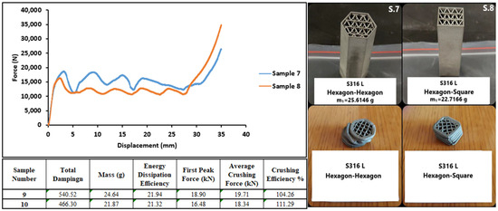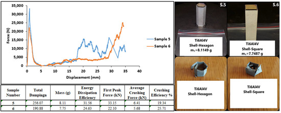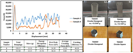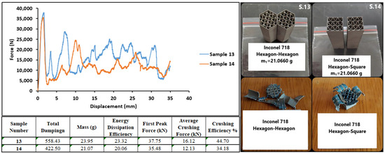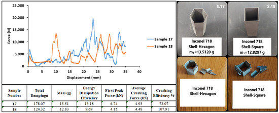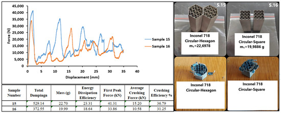 Figure 24 shows graphs of the test results of the 15th and 16th Inconel 718 specimens. The specimens showed brittle behavior during the axial compression test. However, as the wall structure was not separated from the whole, high reaction forces were generated. Due to the hexagonal structure geometry, sample number 15 withstood higher forces and showed better damping performance.