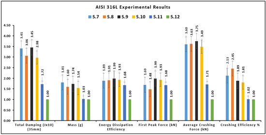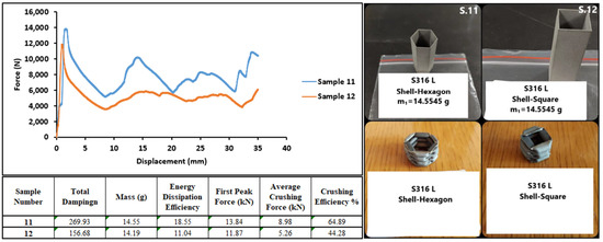 Figure 26 shows the test results for all Inconel 718 powder specimens. When the data are normalized with respect to the square wall structure No. 18, which has the lowest energy absorption performance, it is observed that the hexagonal–hexagonal structure sample No. 13 provides 2.5 times more energy absorption efficiency and 9 times more counterforce in the initial reaction force.