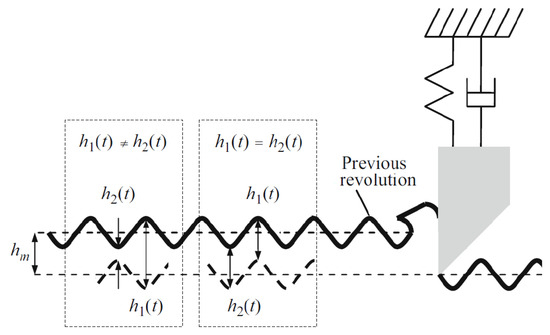 Figure 1 illustrates the regeneration mechanism between a flexible tool and a rigid workpiece in orthogonal cutting. The relative phase shift between the surface waviness of successive passes determines the variation in cutting force. Depending on factors such as mechanical system stiffness, damping, and cutting stiffness, this phase shift is a key variable in determining whether the operation remains stable or leads to chatter. The figure presents two possible scenarios: