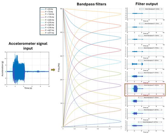 Figure 3 illustrates an example of filtering an accelerometer signal through the N band-pass filters. The figure shows that the power levels of the individual output signals vary, with the highest power observed in the 175 Hz band (highlighted in red in Figure 3). The presence of a significantly higher power signal in this single band compared to others results in a relatively high amplitude in the output of the maximization function, indicating the presence of chatter.