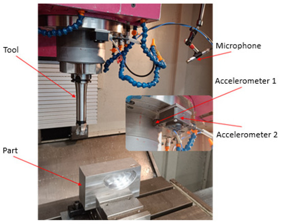 As shown in Figure 4, the setup consists of an aluminium block mounted on a vice on the milling machine table, the tool and accelerometers mounted on the spindle, and the ambient microphone.