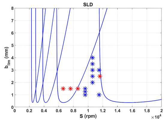 The design of the experiments takes into account the stability lobe diagram, shown in Figure 5, to select the cutting conditions (spindle speed and cutting depth) that result in both chatter-free (blue dots) and chatter-prone scenarios (red dots). For the latter, the level of chatter can be controlled to ensure precise evaluation under different conditions.