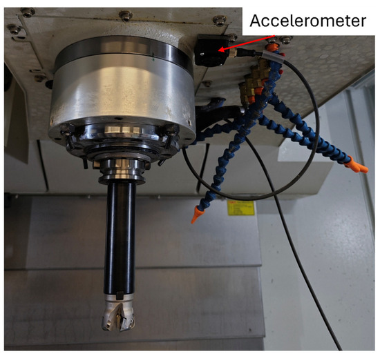 To validate the effectiveness of the developed chatter detector, tests were conducted on a three-axis milling machine. Various experiments were performed to evaluate the performance of the algorithm. Initially, a biaxial accelerometer was mounted as close as possible to the tool, as illustrated in Figure 7.