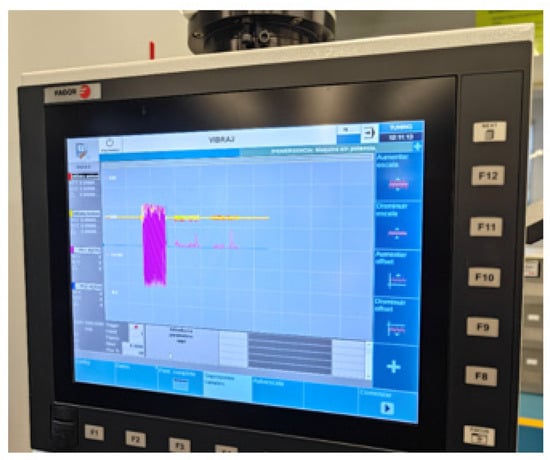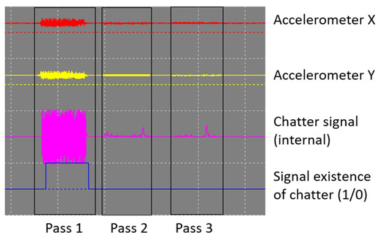Figure 8 shows the most representative signals from the chatter detector for the first test, as displayed on the CNC’s internal oscilloscope. In this test, chatter is present during the first pass. The signals include the accelerometer readings (red and yellow traces), the maximized signal for one axis (pink trace), and the final output of the algorithm (blue trace).