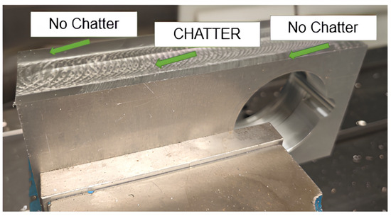 Figure 10 shows the workpiece where the cuts were performed. Upon closer inspection, it is evident that the central part of the piece exhibits a poor surface finish, with visible tool marks and noticeable roughness to the touch. This is due to the vibrations caused by chatter. In contrast, the corners of the workpiece, where chatter did not occur, display a smooth and well-finished surface.