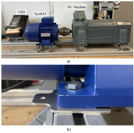 (a) Experimental testbench; (b) shim on the back of the SynRM mounting.