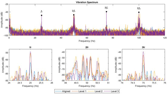 Recent studies have further explored the impact of misalignment on vibration frequencies. In [27], the authors examined different defects known to produce vibrations, with misalignment being the most common issue that leads to dominant vibrations. These results were verified through experimental data by testing the machine under conditions of load imbalance, misalignment, and structural looseness. Furthermore, in [28], the authors investigated both vibration and current signals to detect misalignment in induction motors. Their results showed a marked difference in vibration components at even multiples of the rotating frequency ( and ). In this case, the rotating frequency () did not provide a reliable indication of misalignment. However, the twice supply frequency component () became more pronounced as misalignment levels increased.