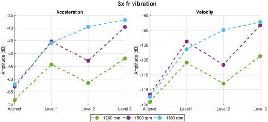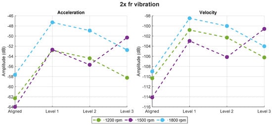 A more detailed analysis is then performed, comparing the amplitude (in dB) of each of the analyzed components in the vibration spectrum (the , , and components) with the motor operating at different speeds of 1200, 1500, and 1800 rpm at nominal load (80% of nominal load when the motor operates at 1800 rpm), directly calculated from the acceleration signal and from the velocity signal obtained by integrating the acceleration signal. The figures compare the results of the aligned motor with each of the different misalignment levels studied.