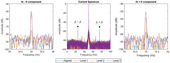 The level of misalignment in the coupling between the motor and load shafts has a certain influence on the spectrum. Misalignment affects the dynamic behavior of the rotor, leading to static eccentricity [29]. Thus, shaft misalignment can be diagnosed by monitoring certain harmonics of the stator current, since an increase in misalignment—or, equivalently, a slight increase in the combination of eccentricities affecting the rotor during operation—results in an increase in the frequencies given by [30].
