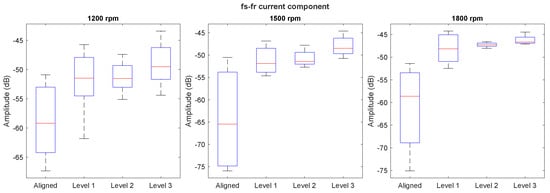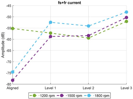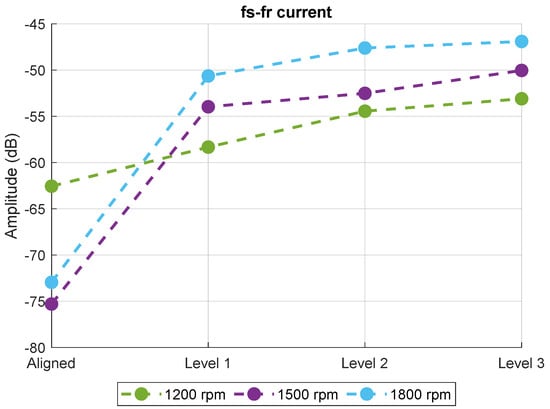 Figure 11 shows the amplitude of the component in the current spectrum when the motor is operating at different speeds under nominal load. Similarly to the component, at higher speeds (1500 rpm and 1800 rpm), the amplitude increases significantly when the motor transitions from being aligned to experiencing a slight level of misalignment. However, this does not occur at lower speeds. At 1200 rpm, the amplitude decreases in the healthy state and the initial misalignment levels, behaving erratically. In fact, the amplitude in the healthy state is around −55 dB, and when the motor operates at 1500 rpm with level 1 misalignment, the value is even lower. At 1200 rpm, the amplitude only increases when misalignment reaches the highest level, and even then, this increase is not significant, as it appears to rise by only 3 dB compared to the aligned motor. Regarding the differences between the various misalignment levels at higher speeds, at levels 1 and 2, the amplitude remains unchanged and even decreases slightly in the second case. These results broadly indicate that this component is not suitable for detecting the presence of misalignment in SynRMs.