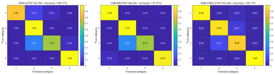 The diagnostic accuracy results are shown in Table 3, and the training confusion matrix is shown in Figure 11. When evaluating the six models, the VMD-CNN-BILSTM-CBAM model performs excellently, with the highest classification accuracy and F1 score of 99.76% and 0.996, respectively. This result highlights the model’s strong classification ability and good generalization capability. However, the drawback is that the computational time is long due to the complexity of the computational timing problem caused by the bidirectional long and short-term memory network (BILSTM) used in the model.