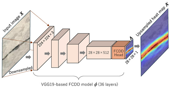 Figure 1 illustrates the overall network structure of the authors’ designed FCDD model. In this subsection, the concept of FCDD [1] and its loss function in training are described in detail. In FCDD implementation, the center c corresponds to the bias term in the last layer of the networks—i.e., is included in the network, which is why c is omitted in the FCDD objective function. In Liznerski’s paper, an FCN model employed in the former part performs , by which a feature map downsized into is generated from an input image X. A heat map of defective regions can be produced based on the feature map. The pseudo-Huber loss in terms of an output matrix from the FCN part, i.e., a feature map, is given by