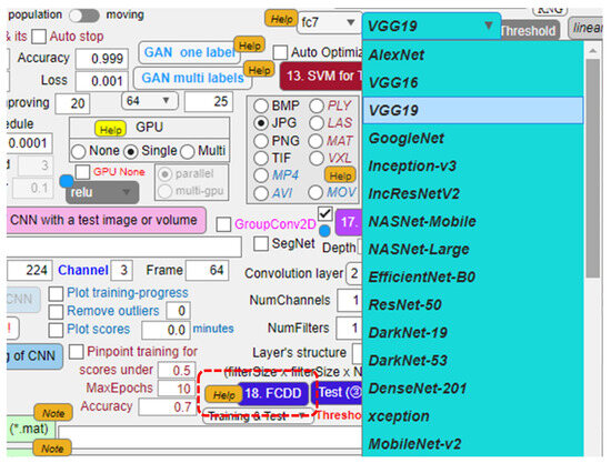The authors applied several kinds of transfer learning-based CNN models, as shown in the drop-down menu in Figure 2, to defect inspection for industrial products and materials [18]. It has been empirically confirmed from classification experiments of test images that VGG19-based transferred CNN models could always perform with a highly accurate detection ability; thus, the same design approach is employed in this experiment for the comparison.