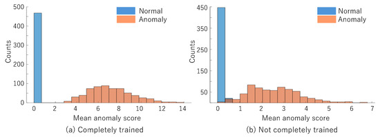 Examples of training results. (a) is completely trained case, in which normal and anomaly samples in training dataset are completely separated. (b) is not-completely trained case, in which overlaps of normal and anomaly bins are seen.