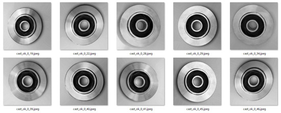 In this section, comparison in terms of classification accuracy and its visualization of understanding is conducted between two types of models by applying them to three kinds of tasks, i.e., two industrial products and one industrial material. The first model is a well-known transfer learning-based CNN model that has been applied to various kinds of defect inspection systems in industrial fields. The second model is the authors’ interesting FCDD model introduced in the previous section. As for the dataset for training and tests, casting manufacturing product images for quality inspection were downloaded from the Kaggle database [17]. Figure 4 and Figure 5 show examples of brake rotors without and with defects, respectively. In the following experiments, a VGG19-based CNN model and a VGG19-based FCDD model are evaluated and compared in terms of defect detection and its visualization.