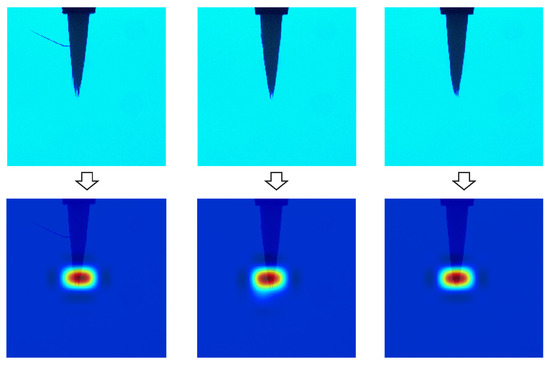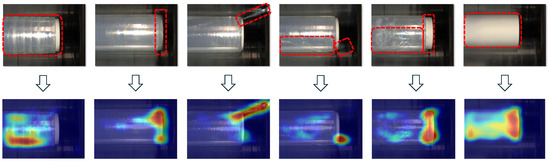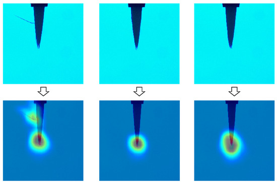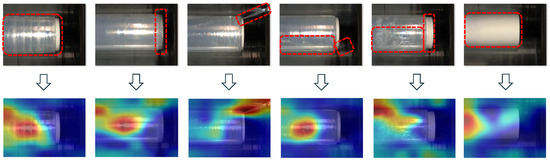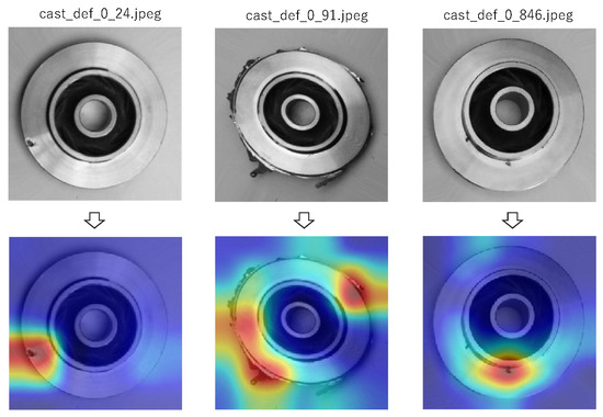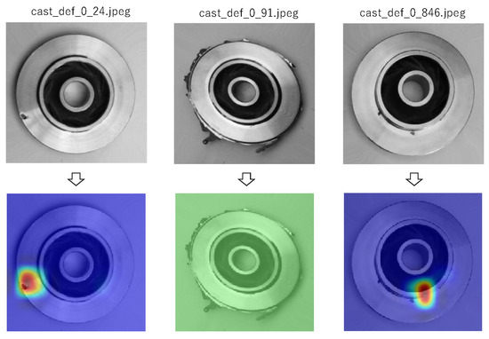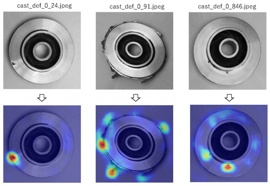 Then, visualization of the model’s understanding, i.e., looking at where the CNN is focused during classification, was generated using Grad-CAM [9] and Occlusion Sensitivity [20]. Figure 7 and Figure 8 show examples of visualization results. The superiority of Occlusion Sensitivity can be confirmed by comparing these two results—i.e., defect regions are identified more clearly and properly in the heat maps. Note that in this experiment, the two parameters of mask size and stride, which are required for Occlusion Sensitivity, were set to 45 and 22, respectively.