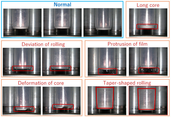 In the third test trial, wrap film products are used for comparison. Figure 16 shows non-defective and defective images on the production line, in which typical defects such as a long core, deviation of rolling, protrusion of film, deformation of core, and taper-shaped rolling are seen. The wrap film products are constantly fed with the same orientation through the automation line, and the snapshots of target film areas are regularly captured by a fixed camera, so that the template matching technique to crop the images to the target film area is easy to apply [22].