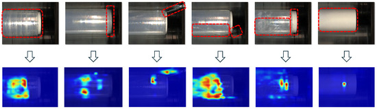 As for technology for visualizing the bases of recognition used by deep learning models, Grad-CAM [9] seems to be commonly used. Mehadjbia and Slaoui-Hasnaoui applied deep learning models such as modified NasNetMobile, MobileNetV2, InceptionV3, and RensNet50 models to a surface defect detection task for metal images, while using the Grad-CAM algorithm for visualizing the regions that were the basis for the detection [10]. Testing results of their model on external images showed its ability to identify and localize defect regions on wind turbine surfaces and other metal panel types. Agrawal et al. investigated how deep learning techniques may be used to detect manufacturing flaws in digital images. Their research results showed that considerable advancements in manufacturing quality control are possible by using a diversified dataset and a tailored CNN architecture, in which Grad-CAM visualization is considered in order to help in decision-making and process optimization [11]. Also, Lee et al. utilized three pre-trained CNN models—GoogleNet, ResNet101, and VGG19—to identify contamination defects of different steps, sizes, and components in the semiconductor fabrication process, so that the results indicated that the recognition accuracy mostly exceeded 85%. In addition, it was reported that the models could accurately identify contaminated areas by Grad-CAM [12]. Although there seem to be few cases where FCDD has been applied, Moupojou et al. proposed a model ensemble solution for the accurate identification and classification of plant diseases using field images. The model uses the Segment Anything Model to efficiently circumscribe all identifiable objects in the image, in which background objects are separated from actual leaf objects using FCDD; the model is known as an explainable deep one-class classification model for anomaly detection [13].