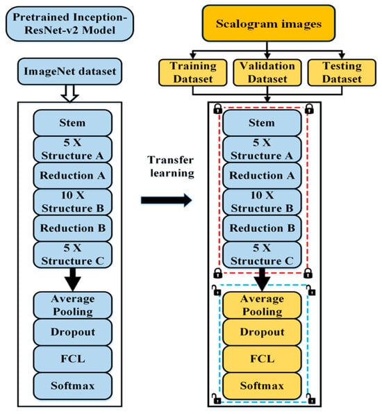 The Inception-ResNet-v2 [19] model is a cutting-edge CNN-based model trained on the ImageNet database. It comprises 164 layers and can segregate images into 1000 distinct classes. In comparison to the millions of images in the ImageNet dataset, the number of tagged fault data are smaller for fault classification. FD can be improved by combining TL with the Inception-ResNet-v2 model. The Inception-ResNet-v2 model, which was trained on the ImageNet dataset, was used in the present work to achieve faster performance and high accuracy in multiple FD in EMs utilizing the knowledge transfer technique. The Inception-ResNet-v2 model, owing to its deep architecture, can extract essential features, and our assumption is that the deep structure of Inception-ResNet-v2 will work well in FD in EMs.