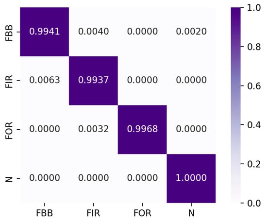 The proposed method aims to identify four different health states based on the vibration data of an EM, and it uses a deep architecture with residual connections to achieve accurate FD. The performance of the proposed Inception-ResNet-v2 model is evaluated using a confusion matrix (Figure 7), which shows the predicted labels on the horizontal axis and the true labels of the samples on the vertical axis. To reduce overfitting, the proposed Inception-ResNet-v2 model uses regularization techniques such batch normalization and dropout layers. To make sure the results are consistent and not unique to a particular train–test configuration, we also conducted many training and testing cycles utilizing shuffled data splits. The confusion matrix demonstrates that the chances of misclassification of certain states, such as FIR, FOR, FBB, and N, were minimal. The mean accuracy of the proposed model was 99.80%, indicating its effectiveness in accurately identifying the different states of the EM. This accuracy measurement helps in analyzing the overall system performance on overall available classes. Training and testing of the developed framework were implemented multiple times to achieve the best result. Also, for the in-depth analysis, the performance indices like precision (p), recall (r), and F-1 score (F1) were calculated. The values of p, r, and F1, as shown in Table 1, were over 0.99, which renders the high performance of the model. The chance of misclassification between two states was below 0.01, which is vital for developing an effective FD system. The deep architecture of the model also helps to boost the domain adaptability of the model too.