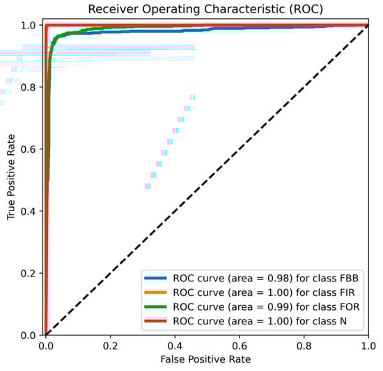 The proposed model’s performance was compared to that of a shallow CNN model with five convolution layers and a fully connected layer. The shallow CNN model achieved a mean accuracy of 90.60%, which is lower than that of the proposed model. The performance indices like precision (p), recall (r), and F-1 score (F1) are given in Table 2. The performance indices were between 0.86 and 0.95, which indicates that the chances of misclassification were on the higher side. The proposed model was also compared with the other established techniques. The receiver operating characteristic (ROC) curve is key metric for evaluating the model’s performance. The diagonal dashed line represents a random classifier (area under the curve (AUC) = 0.5), and it displays the true positive rate (TPR) against the false positive rate (FPR) at different threshold levels. A model is considered to be highly accurate in differentiating between classes if its AUC is near 1.0. It is evident from Figure 8 that the model achieved outstanding classification accuracy across all the classes, with AUC values ranging from 0.98 to 1.00. The bearing states, such as FIR and N, had a precise AUC of 1.00, which indicates that the model accurately separated these categories and produced neither false positives nor false negatives. With an AUC of 0.99, the bearing state FOR came in second, showing almost flawless classification. The somewhat lower AUC of 0.98 for the bearing state FBB indicates a modest improvement margin, because of small misclassifications. The model’s strong sensitivity and low misclassification rate are further supported by the close clustering of the ROC curves in the upper-left corner. Table 3 presents a comparison of the accuracy of the proposed DL model with other established models that employ different approaches, including deep belief network (DBN) [22], hierarchical CNN (HCNN) [40], empirical mode decomposition-based CNN (CNN-EMD) [41], deep CNN (DCNN) [23], adaptive deep CNN (ADCNN) [24], and multi-CNN (MCNN) [25].