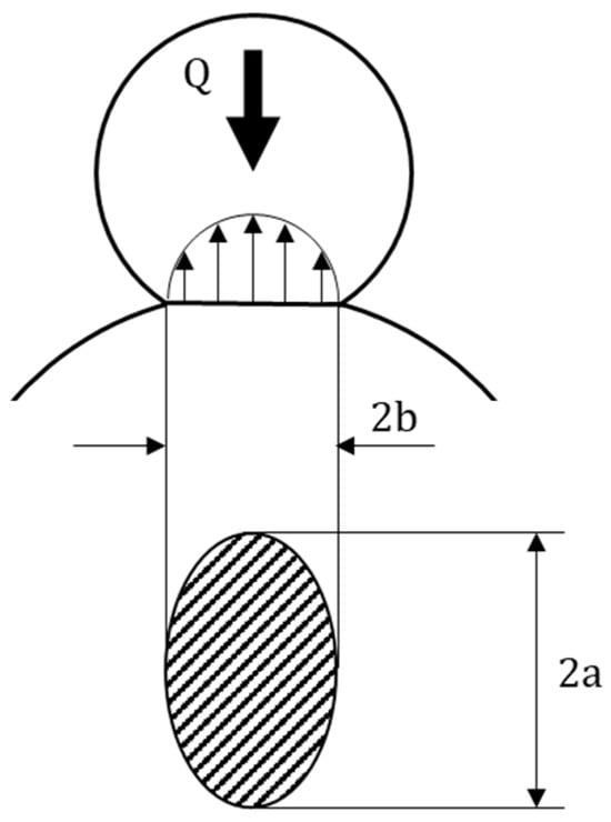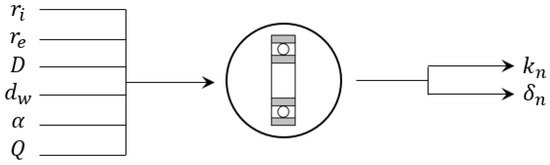 The stiffness of the bearings is calculated based on Hertzian contact theory and with the use of standard ISO 16281 [38]. Under a normal load, the contact area between the ball and the inner and outer raceways is elliptical, as shown in Figure 3. The contact pressure distribution takes the shape of a paraboloid. The normal load can be related to the contact deformation according to the following formulation: