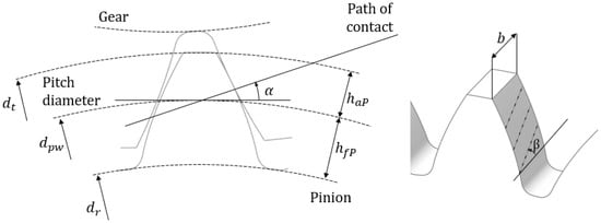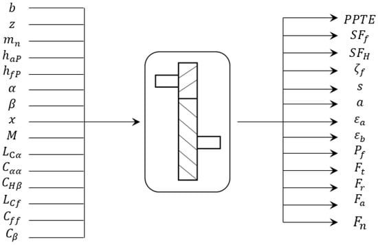 Gear elements are modeled by including both the macro-geometry and the profile modifications applied to the teeth. In Figure 5, all the parameters of the model are summarized and then reported with their units in Table 4. The detailed description of the micro- and macro-geometric parameters are reported in Section 5 and Section 6, respectively.