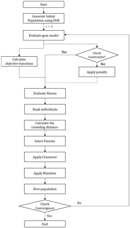 Several multi-objective processes are proposed in the literature to reduce whine noise, improve efficiency, and minimize transmission errors in gear design. One approach uses the Non-Dominated Sorting Genetic Algorithm II (NSGA-II) to optimize both macro- and micro-geometry parameters of a gear unit, aiming to minimize power loss and vibrational excitation, emphasizing the importance of simultaneous optimization of these factors [27]. Another study focuses on agricultural tractors, where gear macro-geometry is optimized using the Non-Dominated Sorting Genetic Algorithm III (NSGA-III) to reduce transmission gear whine noise, leading to a 3.1 dBA reduction in noise levels and improved comfort for the driver [28]. The optimization of helical gear macro-geometry to achieve low weight, high efficiency, and reduced noise is also explored, with a focus on the trade-off among these objectives [29]. Furthermore, the influence of gear tooth addendum and dedendum on optimization results has been investigated, showing improvements when these parameters are considered alongside other design variables [30]. In another work, the response surface methodology is applied for micro-geometry optimization, significantly reducing peak-to-peak transmission errors and contact stress while maintaining the required safety coefficient [31]. A robust methodology for optimizing both macro- and micro-geometry, focusing on minimizing static transmission error and mesh stiffness fluctuations, is introduced, with Monte Carlo simulations used to account for manufacturing errors [32]. Another structured approach combines meta-models and robust optimization to improve gear microgeometry, yielding gains in transmission error reduction and stress minimization [33]. Recent research also investigates the optimization of gear design using a multi-objective approach to find the best way to achieve minimum dynamic excitation, including gear-mesh stiffness and dynamic behavior as objective functions [34]. Finally, robust optimization techniques based on contact ratio control are used to address the effects of mounting errors on helical gears, improving performance under different torque conditions [35].