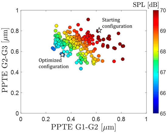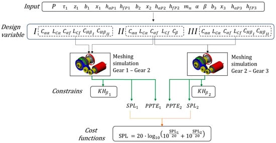 Several studies in the literature address the optimization of transmission noise vibration harshness (NVH) performance, with a focus on the minimization of the transmission error even to design spur gears considering multiple failure modes [36]. However, it is often observed that NVH-optimal solutions can negatively impact reliability, particularly as the contact ratio increases. Moreover, tooth profile optimization is performed not only to reduce transmission error but also to ensure centered tooth contact in the presence of misalignments caused by shaft and housing deflections. Unlike other scientific studies, the optimization of acoustic performance is carried out considering all aspects of the transmission such as reliability, efficiency, center distance, stress distribution along tooth width, and specific sliding. Another difference is the use of the approach to optimize NVH performances. Many studies have explored minimizing the transmission error, while in this work, we used a simplified sound pressure model proposed by Masuda [37], which considers not only transmission error but also macro-geometric aspects of the gears, such as contact ratio, helix angle, transmission ratio, tangential speed, and transmitted power.