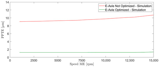 Tooth profile optimization (micro-geometry) is related to the ability to compensate for tooth deflection during meshing due to high loads and misalignment. Tooth bending, gear body distortions, and whole gear body give an overall relative deflection at the contact point that produces a displacement from the ideal angular position of the gears. This effect is measured through the transmission error (TE), defined as the difference between the actual position of the driven gear and what it would be in the case of ideal kinematic meshing [10]. The TE can be evaluated in static and dynamic conditions using analytical and numerical approaches [11,12]. Moreover, several novel approaches have been introduced to evaluate the TE in dynamic conditions, using multibody dynamic simulations as a valid tradeoff between accuracy and computational efficiency [13]. Since the TE directly influences the vibration of the gearing system, efforts have been made by the scientific community to reduce the amplitude of the TE. Profile modification is one of the most common solutions to reduce the TE. For this reason, several methods are present in the literature regarding the effects of the profile modification on the dynamic response of the gear system [14,15,16].