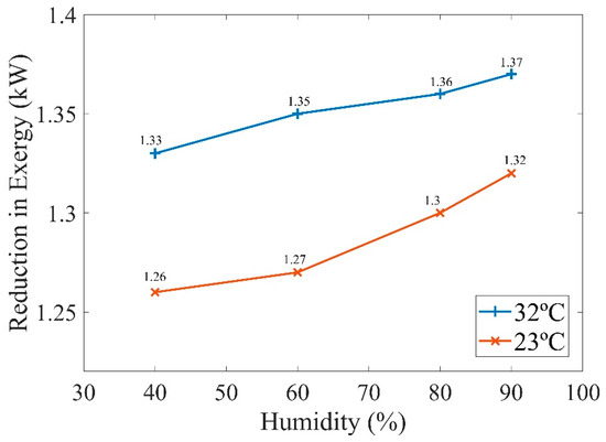 The temperature and humidity in an environment where the HP is being operated primarily affect its exergy levels. Figure 1 shows the relation between the total exergy reduction in “kW” with % humidity at different temperatures (in “°C”). E. Sahin et al. [6] experimentally investigated the effects of temperature and humidity on a heat pump system by analysing the energy and exergy performance for each component, identifying and evaluating the reduction in exergy throughout the system to improve its efficiency. In the experiment by E. Sahin et al. [6], the total reduction in exergy was synthesised for the whole system, which is summarised in Figure 1 for the reference temperatures of 23 and 32 °C, and it was observed that as the temperature and humidity increase, the total exergy level, which is the maximum amount of work performed close to the equilibrium state of the HP system, is reduced.