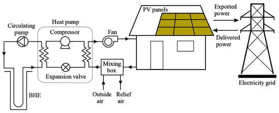 With the increased awareness for reducing energy production from fossil fuels, renewable sources for energy generation have been heavily researched. Figure 2 [29] shows a schematic diagram of a solar-powered borehole-type GSHP system that takes into account recent developments. This type of HP system provides various advantages, ranging from lower power consumption to reduced CO2 emissions. By adding energy back to the grid instead of siphoning it, power consumption can be reduced by an enormous amount [29]. The usage of materials such as metal hydrates yields significant benefits, but high material costs currently makes their use less than effective. However, as efforts are being made to reduce these costs in the future, they are highly anticipated materials [30]. One of the main goals that is always aimed for is the reduction in energy consumption irrespective of technological advancements. Heat pumps are primarily controlled with the thermostat set at a preferred temperature. However, large amounts of heat are wasted with this method, so novel methods of optimal control strategies have also been investigated, some of which have shown promising results in reducing the operational energy costs; for example, a 10% reduction was achieved using an air-sourced HP system for room temperature control [31], and for water temperature control, a reduction of 25% over an 8-week period was achieved by A. Heidari et al. [32]. Currently, air conditioning and heating are performed by different systems in residential applications, but if a single system performs both operations, there will be many benefits from this space saving. A horizontal GSHP system experiment used for both heating and cooling residential spaces was introduced in Italy by S. Bordignon et al. [33] that achieved a maximum water temperature of 65 °C, and the room temperature was maintained at a range of 18–23 °C. An integrated design of a heat pump with a different working fluid was also proposed. Use of the primarily CO2-based R290, when compared to the commonly used R410, reduced costs by 36% and emissions by 52%, but these benefits were slightly negated because of the reduced COP (by 26%) [34]. Further novel concepts, such as exhaust air recovery for HP systems, are also being considered for improving performance [35,36]. Underfloor heating system, a recent development in residential heating, has become common practice now [37]. Hybrid HP systems are also being considered to achieve more sustainable heating for old residencies to overcome the problem of poor insulation or high energy losses due to outdated practices [38].