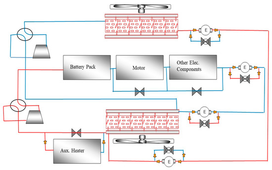 Electronic components for the local temperature control cycle include a compressor/pump, a four-way valve, an auxiliary heater, an expansion valve, a one-way valve, a bypass valve (the number of valves depends on the number of individual circuits for the electronic components) and an external fan [45]. The two main working modes, standard in both the cycles in their design, are heating and cooling, the same as in any heat pump system.