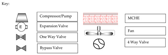 It can be observed in Figure 3 that there is an auxiliary heater present. This is activated when frosting of the external crossflow MCHE occurs and remains active until the defrosting of the HX is complete. Therefore, it can be said that when both cycles are in a cooling mode, the auxiliary heater is in the working condition, and when it is not needed, the bypass applies [51].