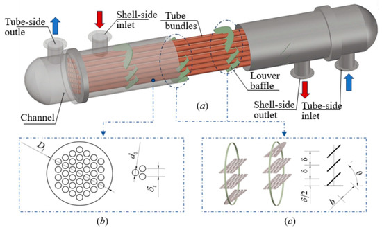 Shell and tube heat exchanger (a) Isometric View (b) Cross-Section View (c) Louver [83].