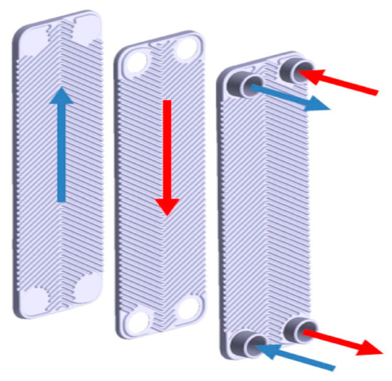 This type of HX consists of a working fluid flowing between plate structures. Multiple layers of plates are stacked upon each other, and these plates have grooves that act as flow paths for the fluid. Depending on the workload, the appropriate number and size of plates are incorporated. The most commonly used design is that of two plates due to its small size in height [85]. An example of a plate HX is shown in Figure 5 [86].