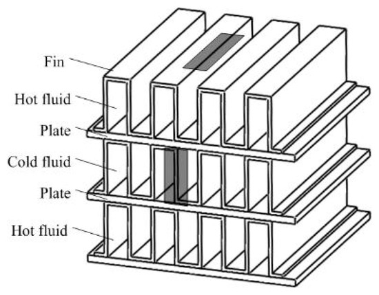 This type of HX is similar to that of the plate-type HX, but instead of small grooves like in the plate type, fins are present between the plates for a multi-layer design. Fins provide additional surface area, which increases the heat transfer rate. Figure 6 [87] shows a multi-layered crossflow plate–fin-type HX, in which two fluids flow in two different directions in different layers [88].
