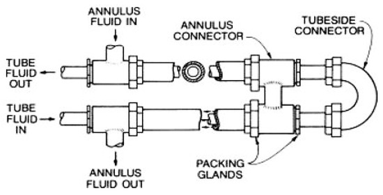 This type of HX is like a tube–shell HX, but instead of the number of tubes in a shell, a double-pipe HX employs concentric pipes. Fluid in the outer pipe surrounds the inner pipe in the same way as in the tube–shell type, where fluid in the shell surrounds the tubes. Figure 7 [90] shows a double-pipe HX.