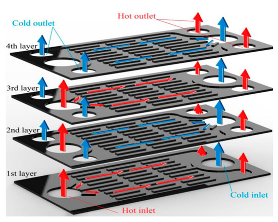 This type of HX consists of micro-sized tube-like structures called channels across the whole HX through which the working fluid passes through, transferring heat from or to the walls of the channels. MCHEs can also be a hybrid between other types of HXs such as the microchannel–fin-type HX or the microchannel–plate HX, with multiple layers of plates together containing microchannel structures within them [49]. Figure 8 [93] shows an example of an MCHE which has 4-layer design [93] or a single-phase flat plate manifold MCHE [94].