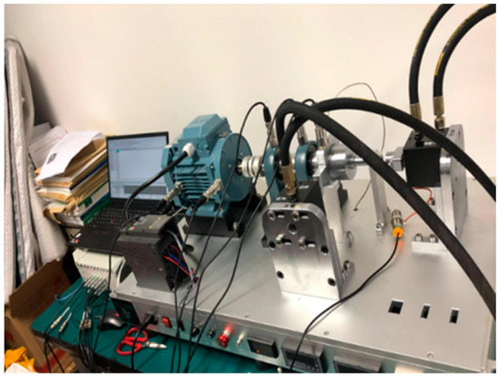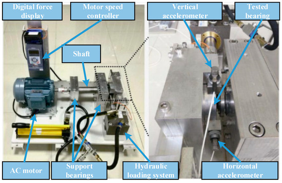 To further evaluate the practical applicability of the proposed algorithm, a bearing signal acquisition system was set up in the laboratory, as illustrated in Figure 9. This setup is designed to collect vibration data from bearings operating under different conditions, including multiple rolling element types (ball, tapered roller, and spherical roller bearings), to comprehensively assess the method’s versatility. It consists primarily of a driving motor, bearing housing, couplings, and multiple sensors. By adjusting rotational speed and loading conditions, the system simulates diverse working states of bearings. Additionally, a data acquisition system is employed to record real-time vibration signals, rotational speed, and other key parameters, providing comprehensive and accurate experimental data for subsequent fault diagnosis analysis. By thoroughly assessing the robustness and accuracy of the algorithm in distinguishing normal and faulty states, its feasibility and effectiveness in real-world engineering applications can be further validated.