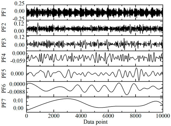 A correlation threshold is set, whereby if , the component is considered to contain essential feature information [20]. Otherwise, it is regarded as noise or irrelevant information and is removed. The selected components are then used for signal reconstruction, with the reconstructed signal expressed as:
