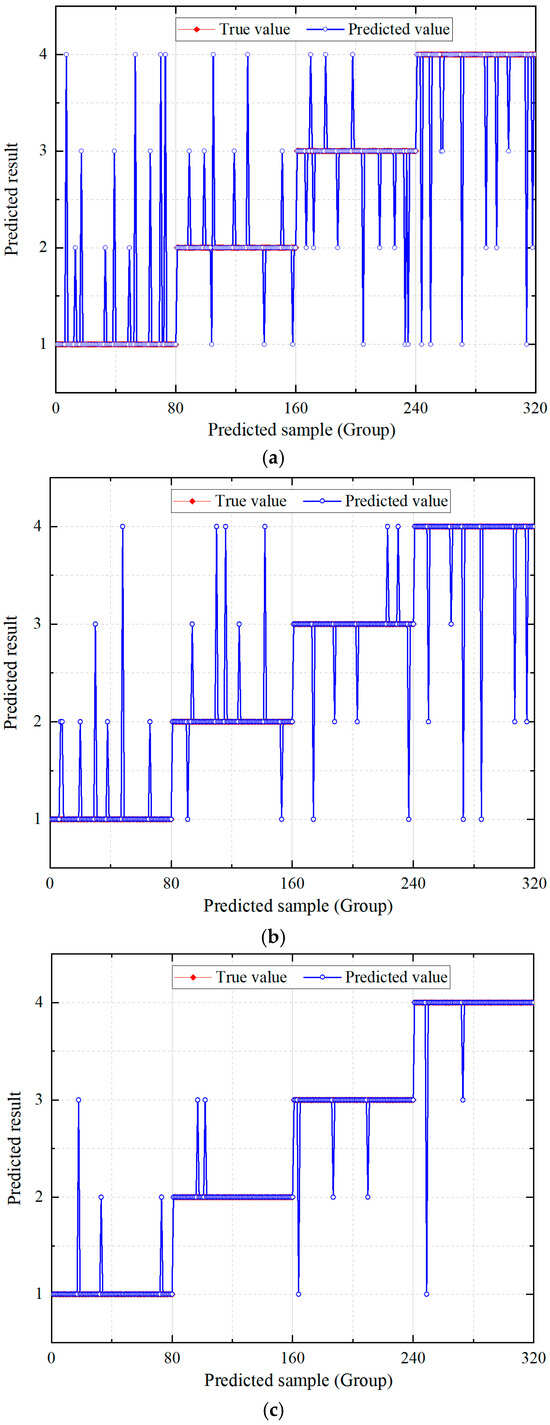 The results indicate that optimization significantly enhances the predictive accuracy of bearing fault diagnosis. The baseline ELM model exhibits relatively low accuracy on both the Xi’an Jiaotong University bearing dataset (Dataset 1) and the laboratory-collected dataset (Dataset 2), suggesting limited generalization capability. The SSA-ELM model, optimized with the SSA algorithm, demonstrates a notable improvement in accuracy, benefiting from enhanced parameter tuning and nonlinear mapping capabilities. However, local optima remain a challenge. In contrast, the MSSA-ELM model achieves over 95% accuracy on both datasets, demonstrating the effectiveness of the proposed optimization strategy in enhancing global search capability and model robustness. Notably, even in the complex signal environment of the laboratory dataset, MSSA-ELM maintains high accuracy, highlighting its superior generalization ability and practical application value.