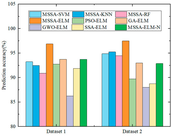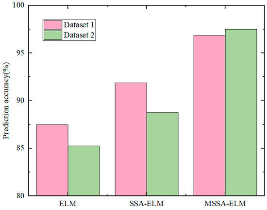 Based on the collected bearing vibration data, the feature extraction and fault labeling processes were conducted as described in the previous sections. The datasets were used to train and evaluate three models: ELM, SSA-ELM, and MSSA-ELM. The comparative results of the diagnostic accuracy across different datasets are presented in Figure 10.