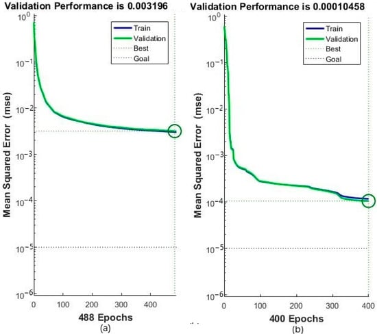 All MATLAB–2024 training functions in the application to diagnostic tasks were verified in our previous study [41], and rainrp (resilient backpropagation) was found the most accurate. Nevertheless, for inverse engine models [42] the trainbr function (Levenberg–Marquardt optimization with Bayesian regularization) was better. Since the choice of the best learning algorithm varies depending on the problem to solve, the experiments with rainrp and trainbr were repeated. Figure 3 illustrates a typical learning process by each algorithm. We can see that the trainbr algorithm yields a by-far-higher accuracy since it does not stay too long in local minimums (as exposed in Figure 3b). Thus, further learning of direct models of all the engines uses the trainbr algorithm.