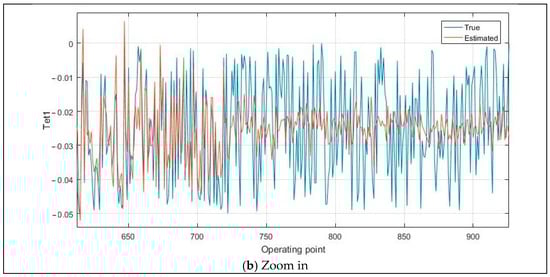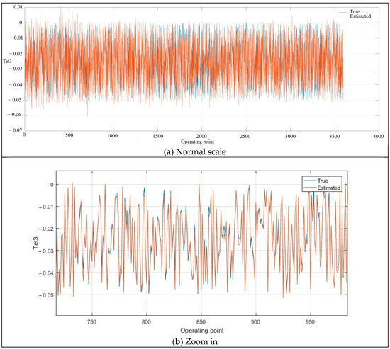 Figure 4 and Figure 5 shed some light on the problem of the estimation of parameter δΘ1. Operating points 1 through 3595 are here presented subsequently for operating modes 1-to 5. Figure 4a shows that the general behavior of the estimates of δΘ1 is abnormal for modes 2-to 4 (operating points 720-to-2876). Figure 4b more clearly illustrates this phenomenon: in the left side of the plot corresponding to mode 1, the estimates follow well to the true values, but from point 720 (mode 2) they change a little around a mean value of 0.025 and do not react on the true values. In contrast, as can be seen in Figure 5, the estimates of the other fault parameters conserve adequate behavior for all operating points. We see two possible explanations for this phenomenon. First, the influence of δΘ1 on the monitored variables significantly changes at different operating modes. Second and more probable, there is a shift in the input data between the parameter δΘ1 and monitored variables at modes 2-to-4. This shift can be caused by a manual manner of forming input data. Anyway, the problem is not critical given that fan blades are well observable, and any damage will be discovered without calculating fault parameters. Thus, the problematic parameter δΘ1 can be excluded from the list of estimated items, and both polynomial and MLP-based models can be successfully used in diagnostic tasks.