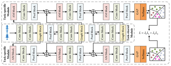 Figure 4 illustrates the MTL-based architecture, which comprises three parallel branches. The top and bottom branches are task-specific pathways, each consisting of attention modules (AM blocks), convolutional blocks, and pooling layers with skip connections to enhance information flow. The middle branch functions as a shared feature extraction backbone, processing input waveform signals through alternating convolutional blocks, graph blocks, and pooling layers. The overall architecture integrates task-specific losses using the formula and outputs to their respective classification matrices via global average pooling (GAP) and Softmax layers. This design demonstrates an effective multi-task learning paradigm that preserves task specificity while enabling efficient feature sharing.