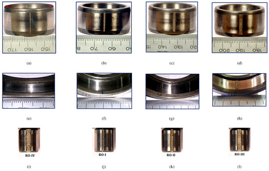 The bearing faults in the CRB dataset. (a–d) Inner race fault. (e–h) Outer race fault. (i–l) Roller fault.