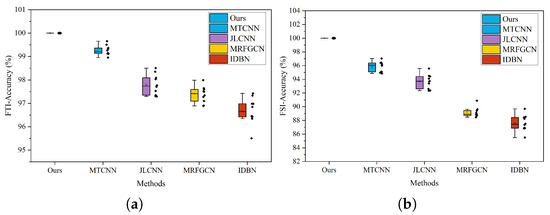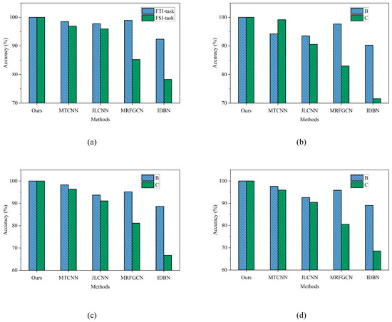 As shown in Table 7 and Figure 13, the proposed MTAGCN significantly outperforms existing state-of-the-art (SOTA) methods in both the FTI and FSI tasks across all four rotating speed scenarios. While MTCNN and JLCNN exhibit competitive performance in the FTI task, MTAGCN consistently surpasses JLCNN in the FSI task throughout all experiments. This demonstrates the effectiveness of MTAGCN in handling multiple tasks simultaneously and improving diagnostic performance holistically. In contrast, JLCNN and other single-task learning (STL)-based methods exhibit relatively lower recognition accuracy in both tasks. Notably, MTAGCN achieves an average diagnostic accuracy of 100% across both tasks, outperforming all comparison methods. Although MRFGCN and IDBN perform well under the scenario, their accuracy drops considerably in , primarily because STL-based methods treat tasks independently and fail to leverage shared features across tasks. Moreover, the diagnostic accuracy of most SOTA methods tends to decline as the rotation speed increases, highlighting the challenge of maintaining robustness under varying operational conditions.