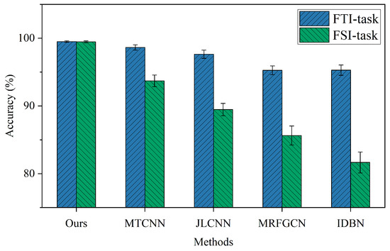 As shown in Table 6 and Figure 12, the proposed MTAGCN achieves 100% diagnostic accuracy on both the FTI and FSI tasks, demonstrating its superior performance and robustness. While MTCNN and JLCNN attain over 95% accuracy on the FTI task, their performance on the FSI task drops to approximately 90%, which is notably lower than that of MTAGCN. Moreover, other benchmark methods, such as MRFGCN and IDBN, exhibit even lower accuracy on the FSI task, with results not exceeding 90%. Additionally, the proposed MTAGCN displays significantly smaller error bars compared to other state-of-the-art methods, further validating its enhanced stability and robustness on the CRB dataset.